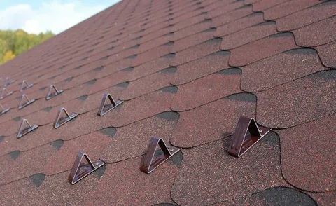 Точечные снегозадержатели – устанавливаются на кровлях из мягкой черепицы или на кровлях из натуральной черепицы. Сами по себе не способны удержать пласт снега от схода с крыши, однако хорошо снижают скорость схода. Рекомендуем использовать данный вид снегозадержателей только в дополнение к основному – трубчатому или пластинчатому снегозадержателю.