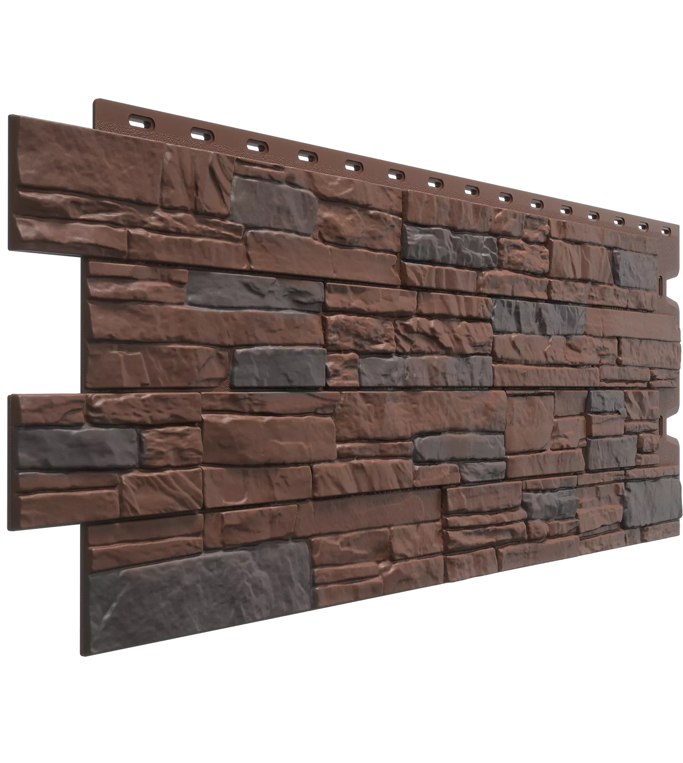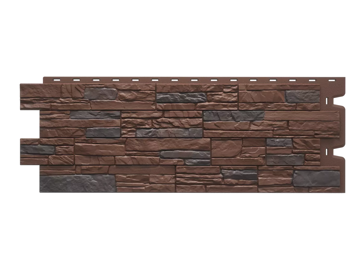 Выбирая панели для отделки цоколя, помните простое правило: цоколь должен быть темнее фасада. Обратите внимание на насыщенный «Тёмный орех», точь-в-точь повторяющий текстуру природного камня. Для полного сходства швы прокрашены в тон основной панели.