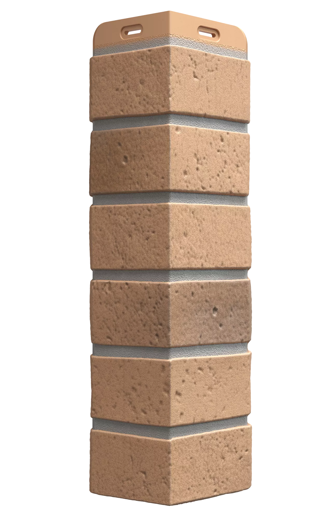 Используйте внешние углы с фактурой золотистого лицевого кирпича для завершения облицовки фасада или его отдельных архитектурных элементов. Светлый оттенок и нейтральные светло-серые швы делают стык панели и угла практически незаметным.