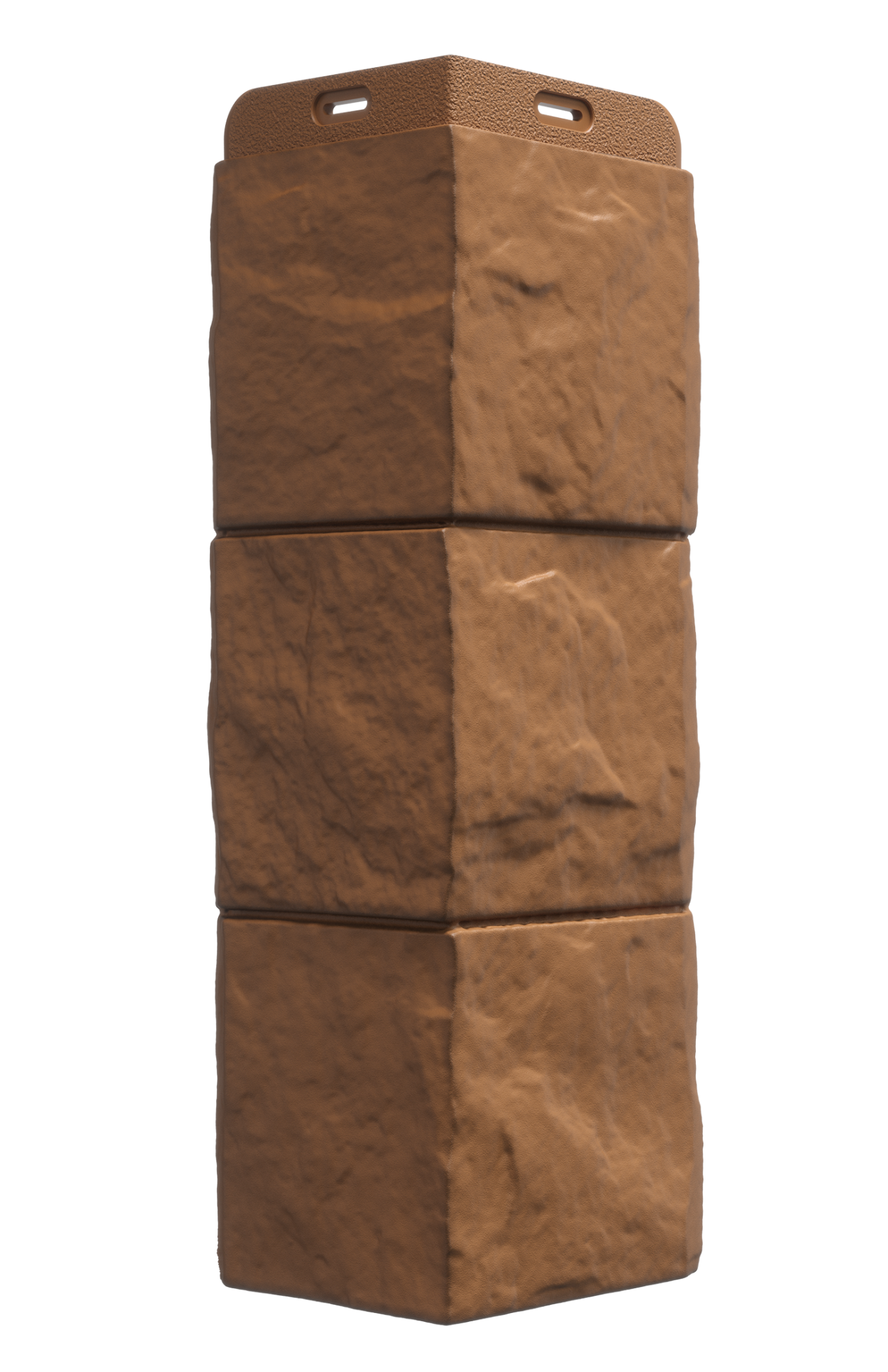 Терракотовые углы с фактурой тёсаного камня аккуратно закрывают торцы панелей и помогают создать эффект крупноформатной каменной кладки. Швы, прокрашенные в основной тон, хорошо маскируют места стыков.