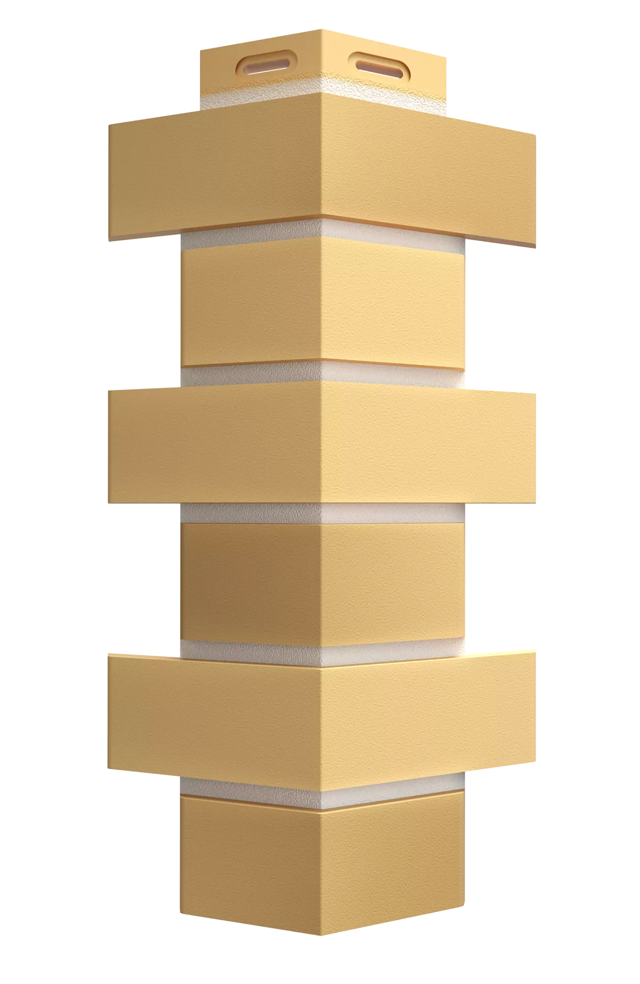Светло-песочная основа с контрастными белыми швами идеально подходит для классических комбинаций «светлый фасад — тёмная крыша». Используйте углы цвета «желтый жженый», чтобы скрыть края фасадных панелей и создать эффект цельной облицовки.