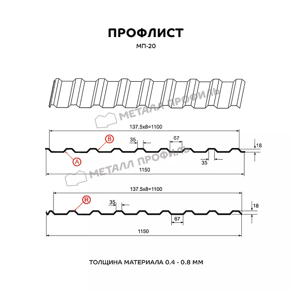 Весьма популярный в Москве профлист с небольшой глубиной гофры – 18 мм. Заявленная в названии маркировка 20 – лишь округлённое число точной величины. Широкий диапазон толщин, в которых выпускается МП-20, а также его функциональные качества дают возможность применять МП-20 в самых различных областях. Профиль 0,35-0,4 мм сгодится для облицовки фасада, поскольку несёт больше декоративную функцию. В данном случае важен небольшой вес и защитное покрытие, определяющее цвет и текстуру материала. Для обустройства кровли лучше брать профиль с толщиной от 0,5 мм – он жёсткостью, чтобы противостоять снежным массам и дождям. Для установки забора оптимальным выбором станет профлист толщиной 0,4-0,5 мм. Металлопрокат от 0,5 мм применяется уже для стеновых переборок в промышленных помещениях, для строительства каркасных сооружений (киосков, гаражей, павильонов).Покрытие ECOSTEEL®: