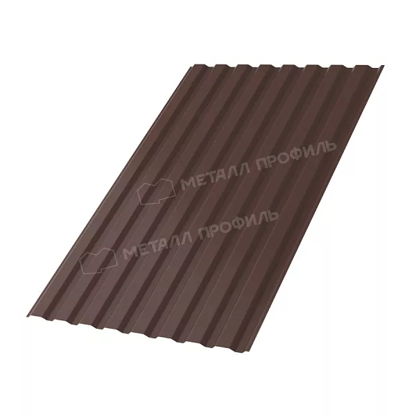 Профиль МП-20 относится к универсальным cтройматериалам. В отличие от многих других видов профлиста, он изготавливается в трёх вариациях: А, В и R. Разновидности А и В применяются для кровельных работ, возведения заборов, облицовки стен, для внутренней обшивки промышленных помещений, гаражей, ангаров и т.п. Вариант с литерой R характеризуется присутствием специального желобка для отвода конденсата и предназначен для обустройства кровли. В зависимости от сферы применения, данный профлист изготавливается из оцинкованной стали толщиной от 0,4 до 0,8 мм. Обратите внимание: несмотря на цифру 20 в названии, на самом деле глубина этого профнастила – 18 мм. Это материал эконом-класса и обладает доступной ценой. МП-20 – прочный и качественный стройматериал, преимущества которого высоко оценивают не только частные лица, но и крупные застройщики. Он отличается приличной несущей способностью, переносит значительные статические нагрузки и эффективно противостоит нагрузкам динамическим.Покрытие Полиэстер: