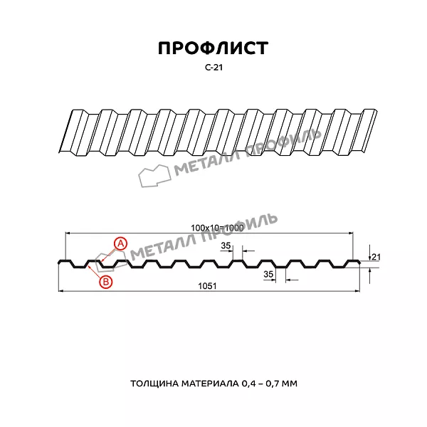 Профлист с маркировкой С-21 означает, что это «стеновой» тип с глубиной волны 21 мм. На самом деле, С-21 – один из наиболее многофункциональных стройматериалов, применяемый не только для фасадов. Он будет уместен как для облицовки стен, так и для обустройства кровли, возведения заборов. С успехом С-21 находит применение при создании складских помещений, быстровозводимых зданий, торговых павильонов, а также как элемент сэндвич-панелей. С-21 отлично подходит в качестве основы для Профилированных листов. Для этого он обладает хорошей несущей способностью. Расположенные на небольшом расстоянии друг от друга трапециевидные волны придают ему достаточную жёсткость. А пропорциональный рисунок профиля, одинаковый с обеих сторон, обеспечивает Профилированным листам эстетичный внешний вид. По вашему заказу мы изготовим профиль С-21 с различной толщиной металла от 0,4 до 0,7 мм. Для повышения срока службы и внешней привлекательности, профилированный лист изготавливается в полимерных покрытиях различных оттенков и текстур, включая покрытия под дерево, кирпич, камень.Покрытие Полиэстер: