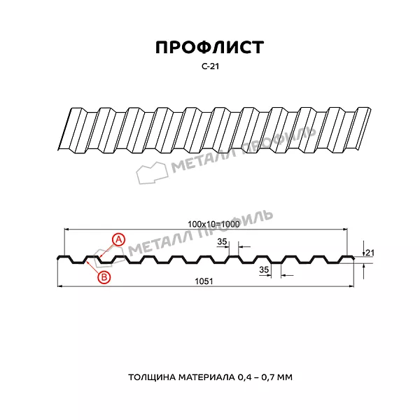 Профлист с маркировкой С-21 следует понимать, как «стеновой» вариант с высотой волны 21 мм. Тем не менее, С-21 – один из наиболее многофункциональных стройматериалов, применяемый не только для фасадов. Он подойдёт как для облицовки стен, так и для монтажа кровельного покрытия, установки заборов. Вполне успешно С-21 находит применение при создании торговых павильонов, складских помещений, быстровозводимых сооружений, а также в качестве элемента сэндвич-панелей. С-21 станет прекрасным выбором в качестве стройматериала для Профилированных листов. Этому способствует его хорошая несущая способность. Довольно близко расположенные трапециевидные волны придают ему достаточную жёсткость. А пропорциональный рисунок гофры, одинаковый с обеих сторон, обеспечивает Профилированным листам эстетичный внешний вид. По вашему заказу мы изготовим профиль С-21 с различной толщиной стали от 0,4 до 0,7 мм. Для увеличения срока службы и внешней привлекательности, профлист изготавливается в полимерных покрытиях различных оттенков и фактур, включая покрытия под дерево, камень, кирпич.Покрытие Полиэстер: