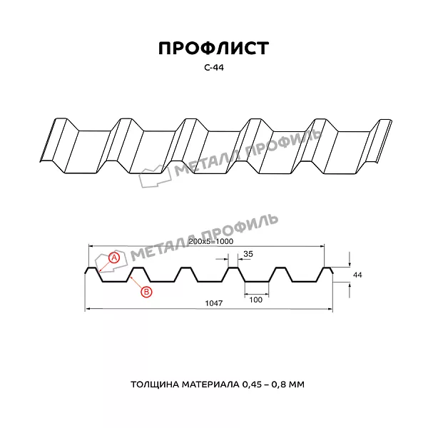 Профилированный лист С-44 применяется практически во всех сферах строительной отрасли. Этот профлист в равной степени востребован как в гражданском секторе, так и на индустриальных стройках. Профнастил с высотой трапеции 44 мм характеризуется довольно высокими несущими способностями. Это наиболее рельефный из профилей с обозначением С – «стеновой». С-44 пригодится, если вам нужно: оборудовать подсобные помещения, поставить ограждения, установить стены и перегородки в щитовых постройках, сделать кровельное покрытие. Помимо этого С-44 характеризуется необходимой прочностью для возведения каркасов зданий и несъёмной опалубки для бетонирования. Профлист С-44 разрешено устанавливать в областях с высокими показателями годовых осадков и порывистыми ветрами. Профиль этого материала асимметричен. Лицевая часть (А) имеет более динамичный рисунок из узких полочек и используется для кровли. Сторона В выглядит более монолитно, подходит для всех остальных сфер применения.Покрытие Полиэстер: