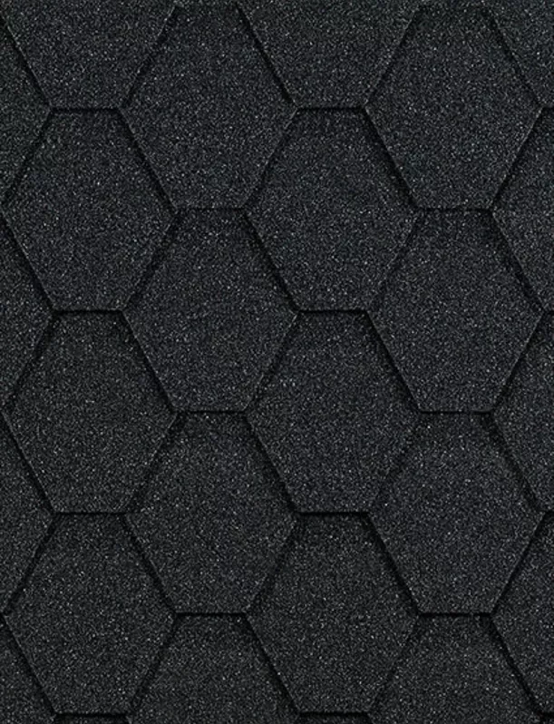 Финишное покрытие кровли в виде гибкой черепицы осуществляется на сплошное основание, уклон крыши должен составлять не менее 12 градусов. В коллекции Шестигранник широкий выбор цветов черепицы, включая универсальный серый оттенок.