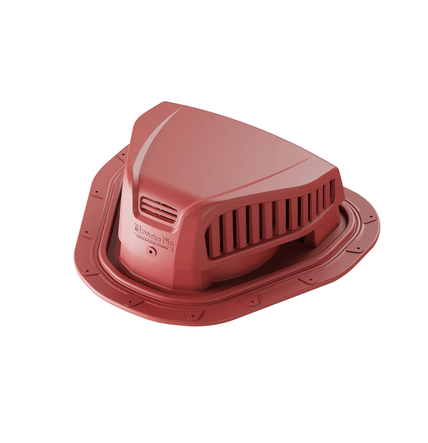 Отличный выбор, чтобы обустроить систему вентилирования подкровельного пространства и сделать яркий акцент в дизайне. Приглушенный красный оттенок аэраторов визуально усилит цвет красно-коричневой кровли.