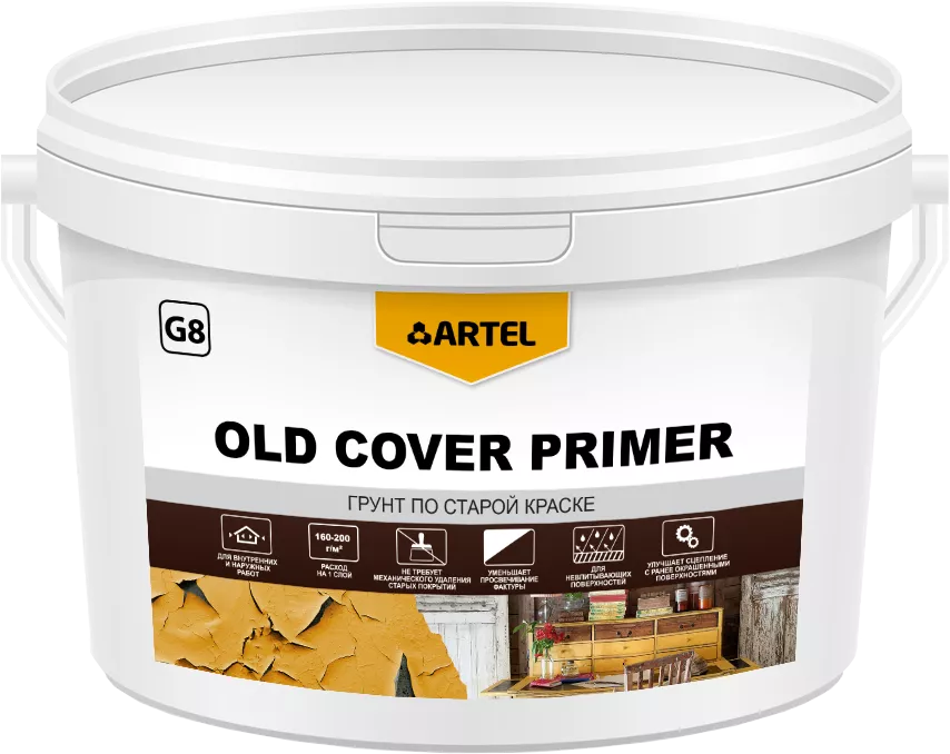 ВНИМАНИЕ! Минимальная цена заказа на продукцию ARTEL составляет 10 000 рублей и не суммируется с товарами других производителей! Грунтовка по старой краске Artel G8 Old Cover Primer. Вязкий, готовый к применению состав молочно-белого цвета. Изготовлен на основе импортного сырья, не содержит вредных веществ.Предназначен для грунтования различных видов поверхностей, ранее окрашенных алкидными или масляными красками, под дальнейшую окраску или отделку материалами на водно-дисперсионной основе (красками, лаками).Для наружных и внутренних работ. Экологичная, подходит для детских комнат, лечебно-профилактических учреждений и предприятий пищевой промышленности.