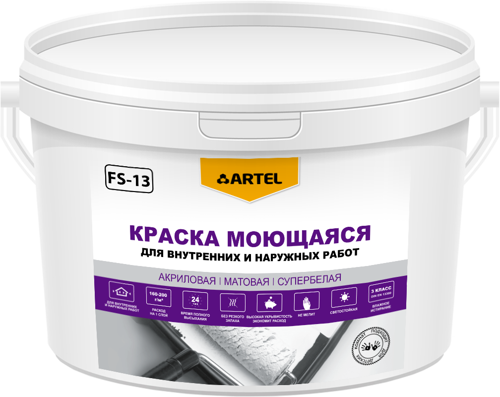ВНИМАНИЕ! Минимальная цена заказа на продукцию ARTEL составляет 10 000 рублей и не суммируется с товарами других производителей! Краска для стен моющаяся, водоэмульсионная акриловая ARTEL FS-13 БАЗА C. Применяется для высококачественной окраски стен и потолков в помещениях с нормальной и повышенной влажностью, для фасадов, защищенных от прямого попадания воды. Моющаяся краска подходит для нанесения на все типы обоев, штукатурку, бетон, кирпич, гипсокартон, древесину и другие прочные, чистые и сухие поверхности в интерьере.Экологичная, подходит для детских комнат, лечебно-профилактических учреждений и предприятий пищевой промышленности.