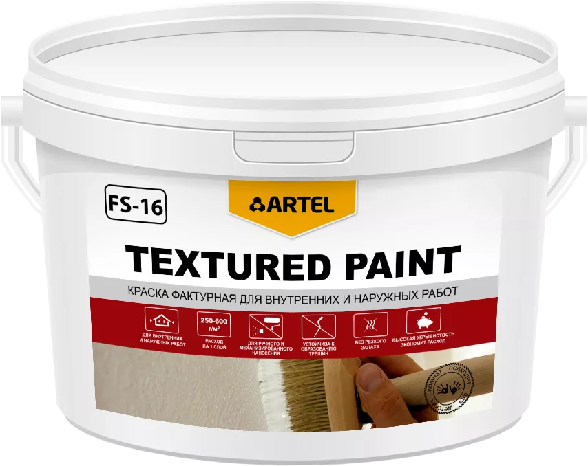 ВНИМАНИЕ! Минимальная цена заказа на продукцию ARTEL составляет 10 000 рублей и не суммируется с товарами других производителей! Фактурная краска для стен ARTEL FS-16. Применяется для высококачественной окраски стен, для внутренних и наружных работ. Подходит для покраски стен в детских комнатах, пригодна как для ручного так и для механизированного нанесения. Высокая устойчивость к образованию трещин и укрывистость.