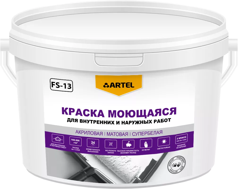 ВНИМАНИЕ! Минимальная цена заказа на продукцию ARTEL составляет 10 000 рублей и не суммируется с товарами других производителей! Краска для стен моющаяся, водоэмульсионная акриловая ARTEL FS-13. Применяется для высококачественной окраски стен и потолков в помещениях с нормальной и повышенной влажностью, для фасадов, защищенных от прямого попадания воды. Моющаяся краска подходит для нанесения на все типы обоев, штукатурку, бетон, кирпич, гипсокартон, древесину и другие прочные, чистые и сухие поверхности в интерьере.Экологичная, подходит для детских комнат, лечебно-профилактических учреждений и предприятий пищевой промышленности.