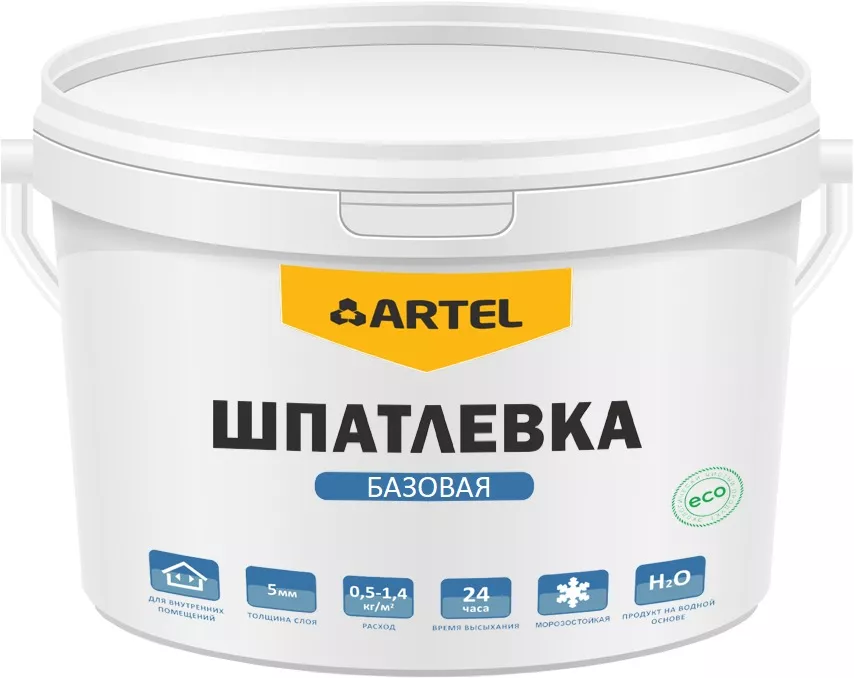 Базовая шпатлевка ARTEL предназначена для выравнивания поверхностей и заделки углублений и трещин внутри сухих помещений. Имеет хорошую адгезию к бетону, кирпичу, штукатурке, гипсокартону, фанере, ДСП. Идеальна для заделки стыков гипсокартона.