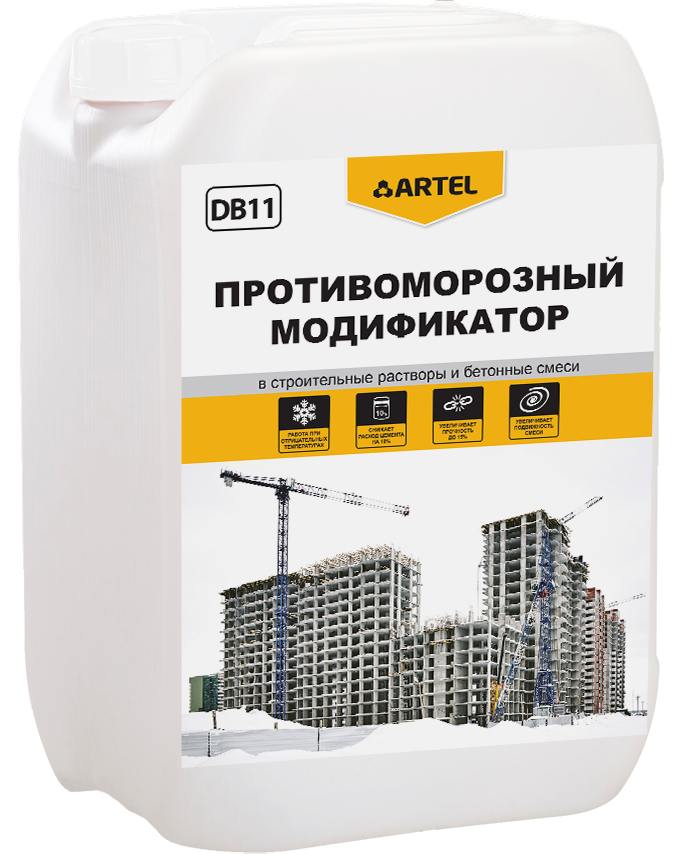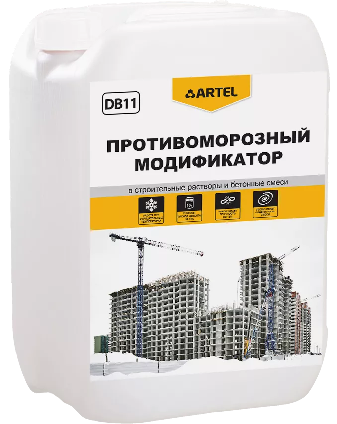 ВНИМАНИЕ! Минимальная цена заказа на продукцию ARTEL составляет 10 000 рублей и не суммируется с товарами других производителей! Модификатор применяется при проведении бетонных работ в условиях отрицательных температур. Ускоряет твердение бетона, легко пластифицирует и улучшает подвижность рабочего раствора. Время образования пленки 30-60 минут при температуре +20°C и относительной влажности воздуха 65%. Полное высыхание в течение 2-3 дней. При более низкой температуре и повышенной влажности воздуха время высыхания увеличивается. Через 28 дней покрытие приобретает окончательную прочность. Добавка пожаро- и взрывобезопасна. При работе пользоваться средствами индивидуальной защиты органов дыхания, глаз и кожи рук. При попадании на кожу и в глаза промыть водой.