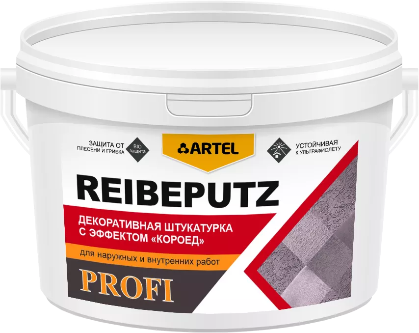 ВНИМАНИЕ! Минимальная цена заказа на продукцию ARTEL составляет 10 000 рублей и не суммируется с товарами других производителей! Декоративная штукатурка Reibeputz Profi короед фасад ARTEL предназначена для изготовления тонкослойных декоративных покрытий с бороздчатой фактурой на бетоне, цементных и гипсовых штукатурках, гипсокартоне, древесностружечных плитах и других подобных основаниях. Для наружных и фасадных работ. Короед фасад прекрасно подходит для отделки фасадов домов, образуя прочное, долговечное покрытие. Также подходит для помещений с высокой эксплуатационной нагрузкой. Может колероваться или окрашиваться сверху.