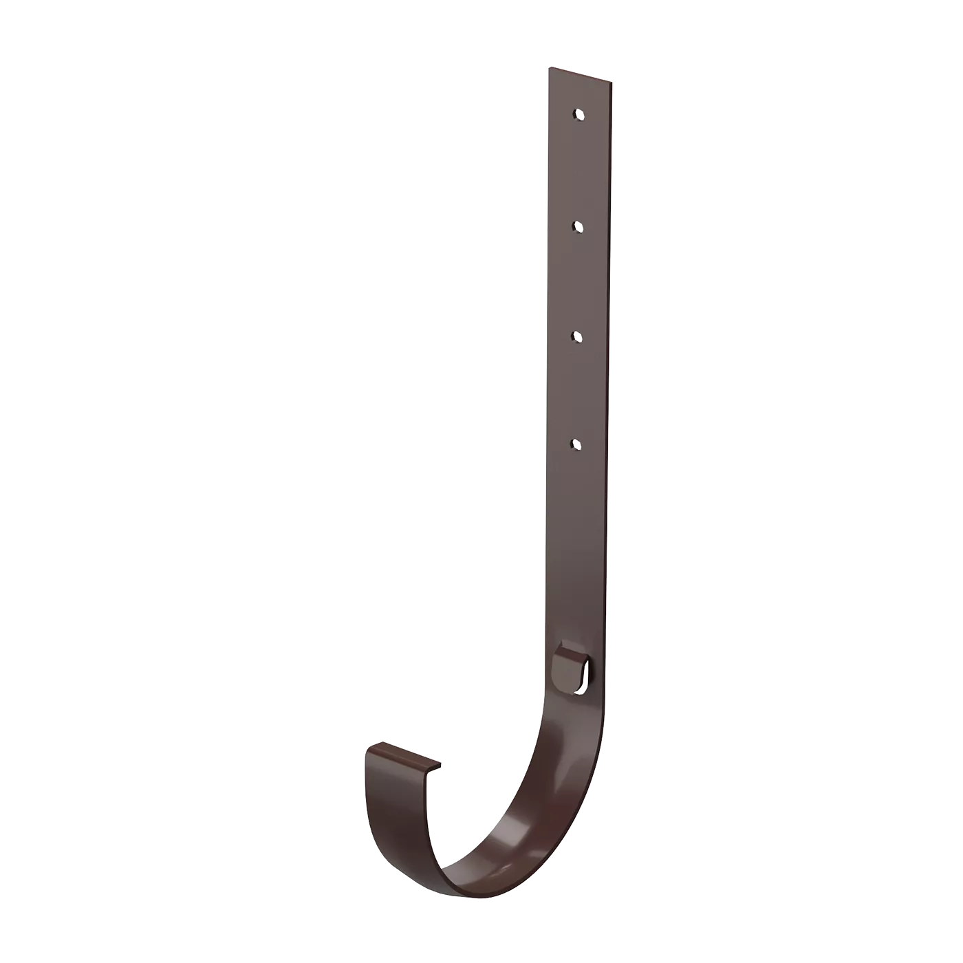 Металлические кронштейны желоба, окрашенные в оттенок коричневого «Шоколад» используются для крепления к стропилам или иной основе крыши без лобовой доски. В них закрепляется желоб такого же цвета.