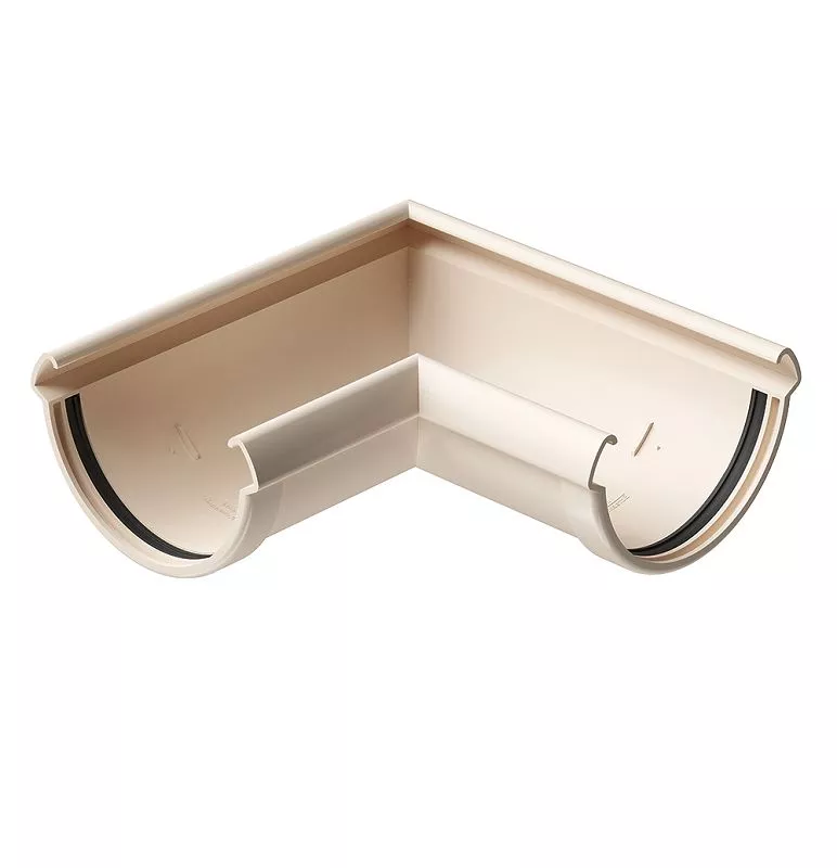 После фиксации желобов в кронштейнах, их соединяют угловым элементом с прямым углом в 90˚для стандартных квадратных и прямоугольных зданий, в целях перенаправления воды без переливов за края водосборной системы. В серии «LUX» углы желоба универсальные, могут использоваться как на внутренних, так и на внешних углах.