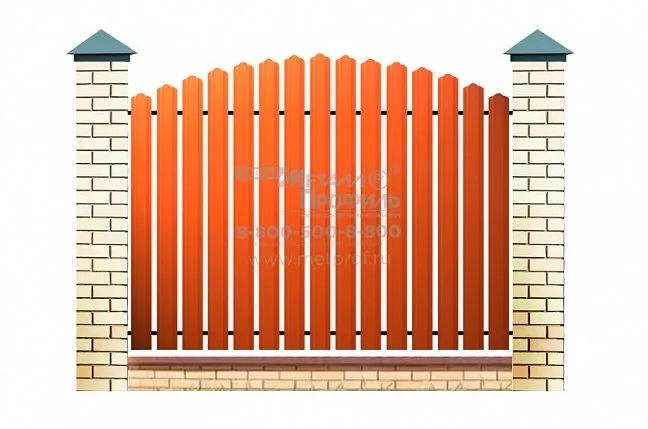 Металлический штакетник предельно прост в монтаже, причем установку его можно производить как горизонтально, так и вертикально. Интересной особенностью этого материала является возможность выбирать между односторонним и двусторонним заполнением. В первом случае готовое ограждение имеет вид, схожий с привычными деревянными аналогами: установленные с интервалом в 80 мм профили будут пропускать на участок солнечный свет и воздух, приоткрывать прохожим вид красивого, ухоженного ландшафта. Если же существует необходимость максимально укрыть дом и сад от посторонних глаз, выбирается двусторонняя компоновка — при интервале между профилями в 40 мм она обеспечит глухое ограждение, однако одновременно сохранит и прекрасную вентиляцию участка. Кроме того, варьируя размеры штакетин по высоте, можно добиваться сложного и эффектного рисунка забора в целом, с плавными «волнами» и переходами.