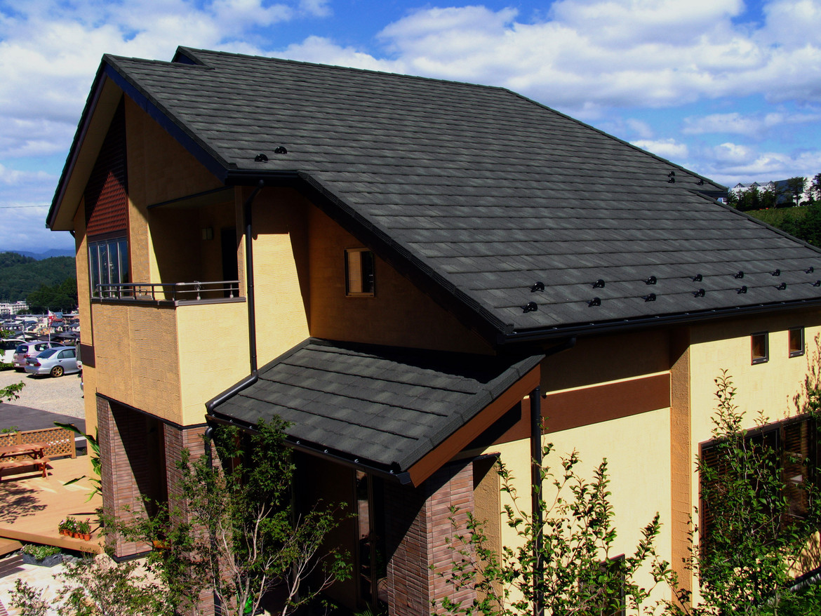 Материал создает эффект дорогой кровли из природных материалов (натурального сланца, черепицы), но весит меньше и стоит дешевле, что открывает большие возможности для интересных дизайнерских решений. Срок службы такой кровли - минимум 50 лет.