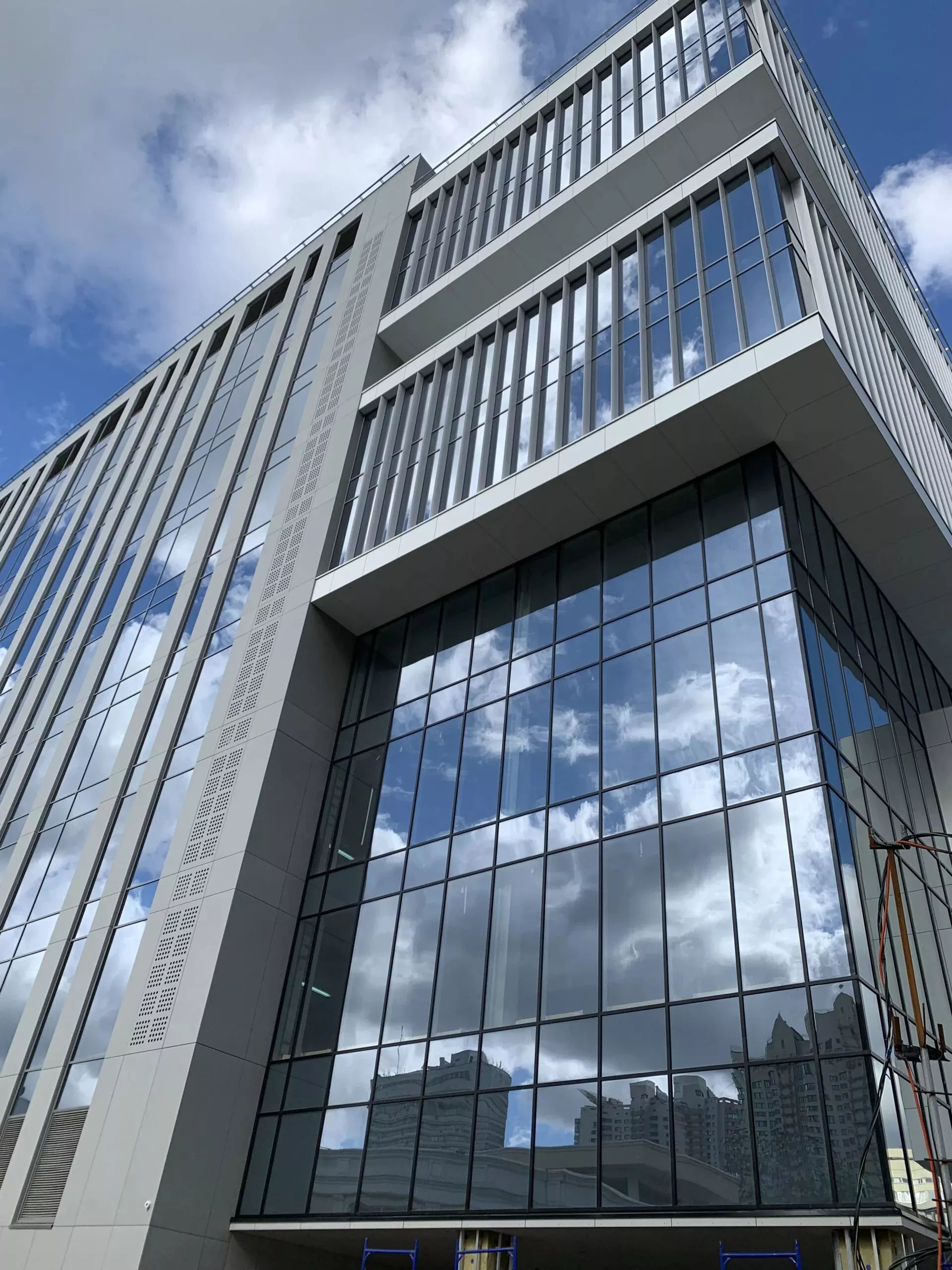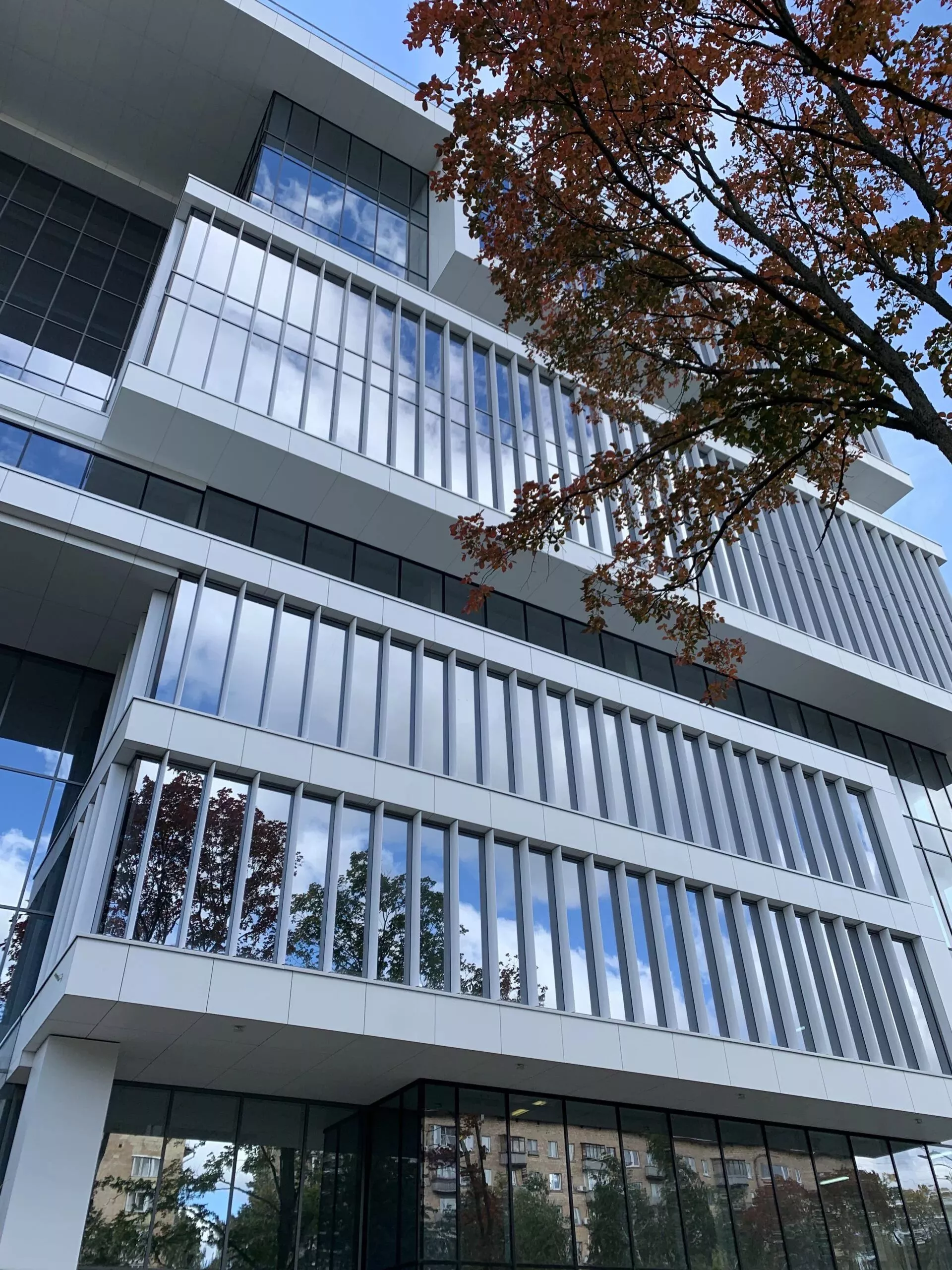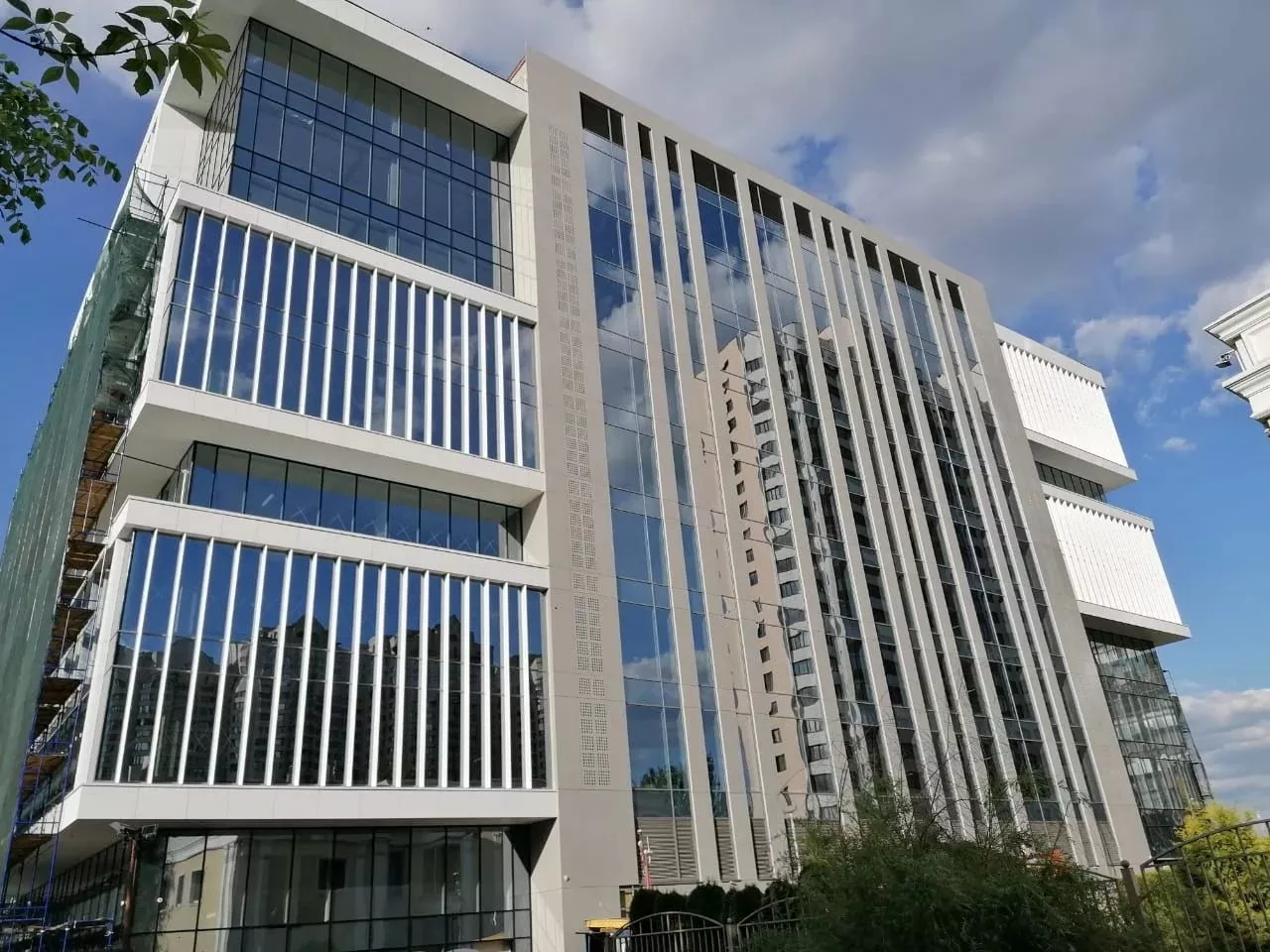 Отделка офисного здания в Москве площадью 1800 квадратных метров заняло около полугода. В процессе его отделки наши бригады неоднократно преодолевали различные трудности в виде: неработающих лифтов и пешего подъема по лестницам на высоту 14 этажей, запреты выхода на фасад из-за штормовых предупреждений, ведение одновременных работ с другими организациями (пожарные, лифтеры, электрики, витражники), раскрой материала прямо на объекте и др. Под строгим контролем технического надзора работа была завершена успешно и в срок.