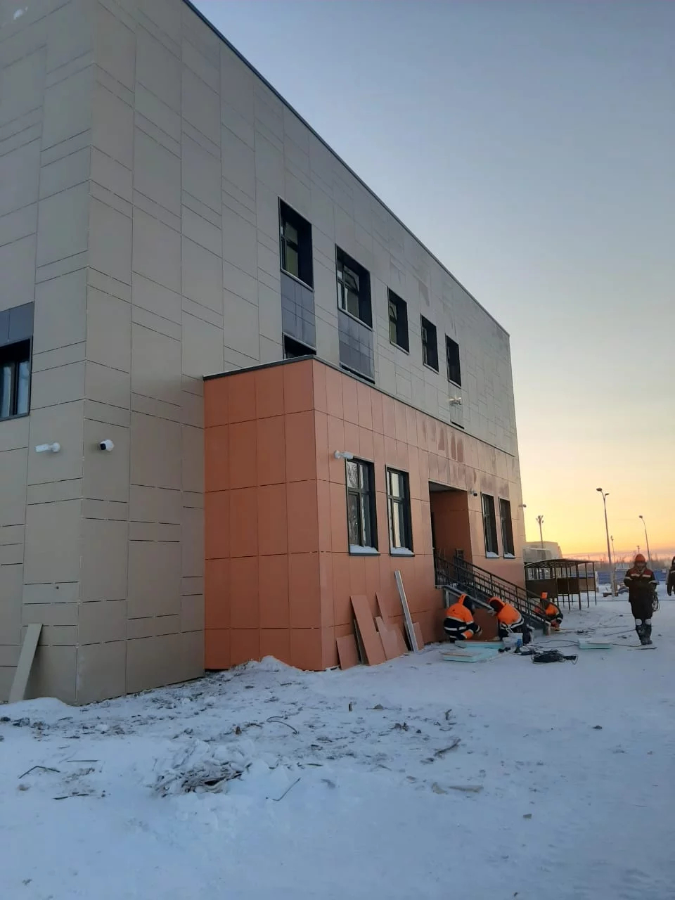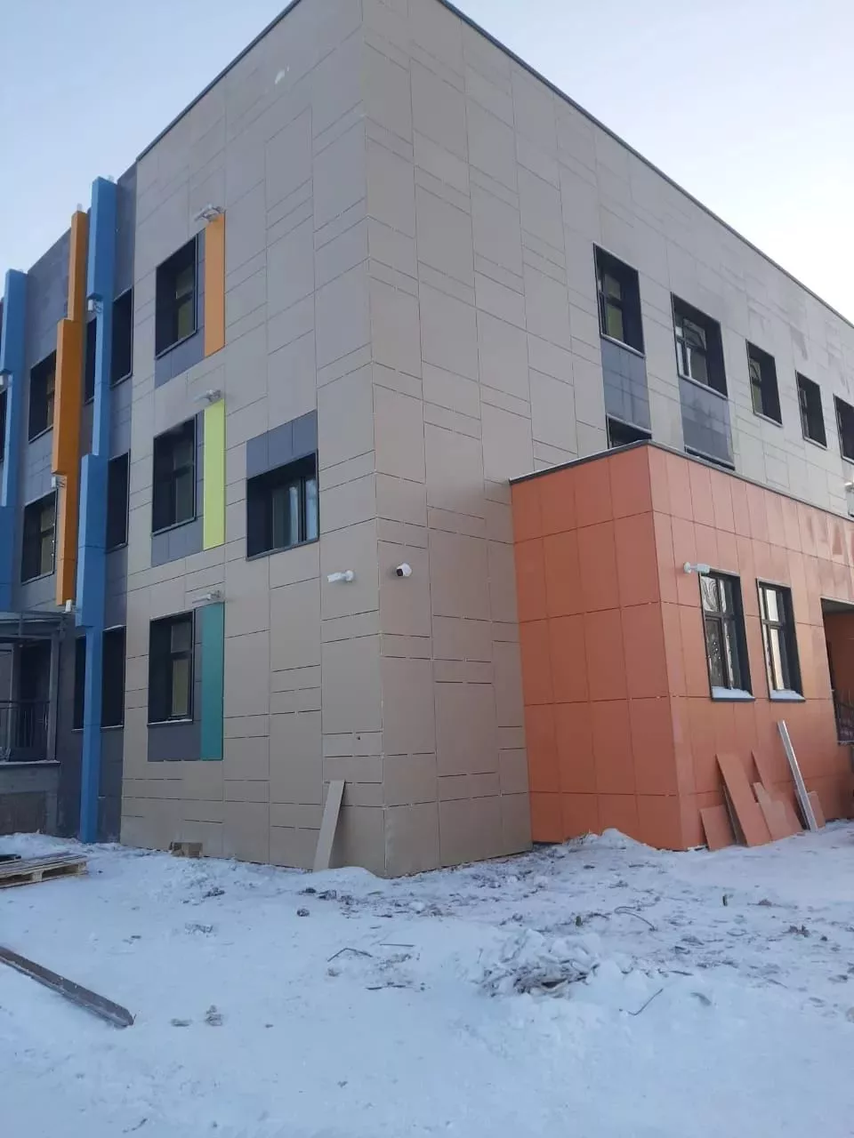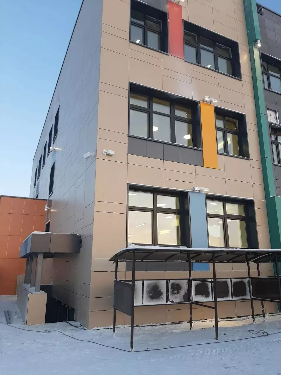 Облицовка и утепление здания детского сада в Новом Уренгое выполнена керамогранитом. Не смотря на трудности в виде морозов в минус 35 градусов и сильных ветров - фасад площадью около 200 кв.м. был отделан за 28 дней. Новое здание детского сада было готово к открытию точно в срок. Перечень выполненных работ:Установка подсистемыУтепление 100 ммОблицовка фасада