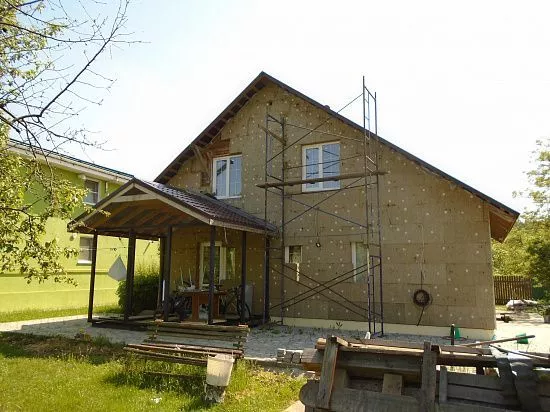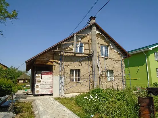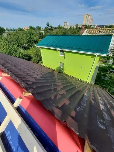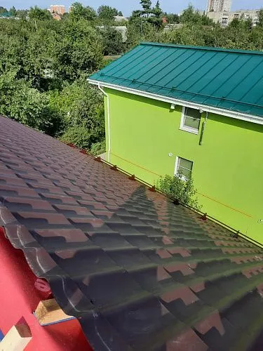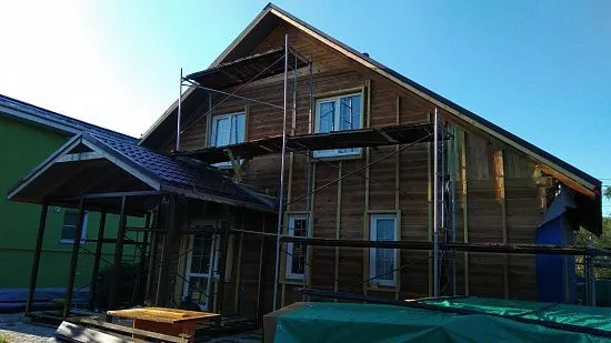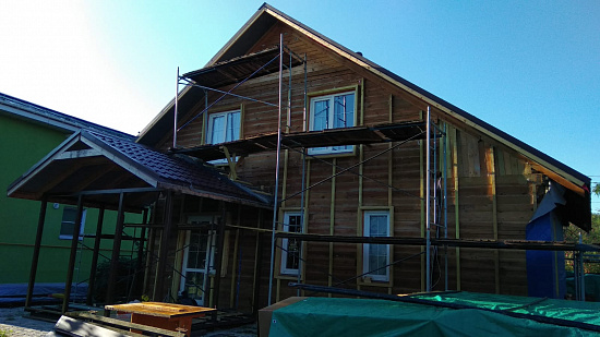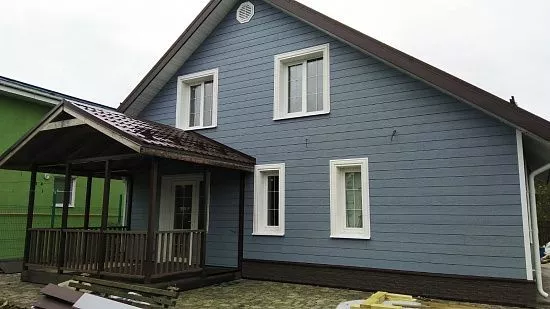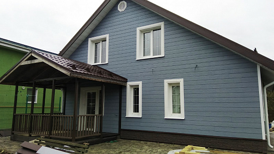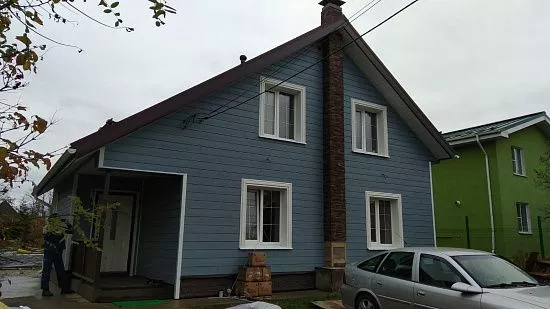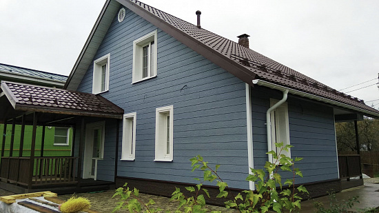 Отделка фасада дома фиброцементным сайдингом Cedral Клик Голубой океан, ремонт кровли и монтаж металлочерепицы Grand Line Classic красного цвета Ral 3009