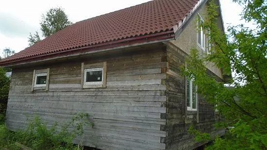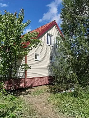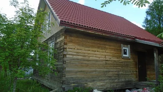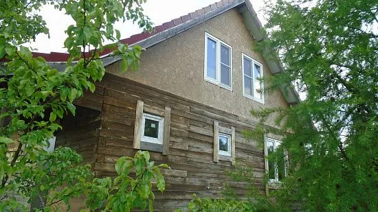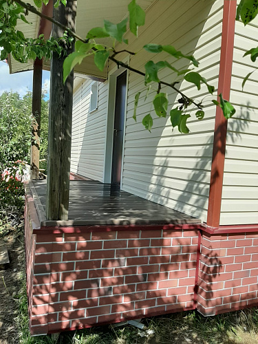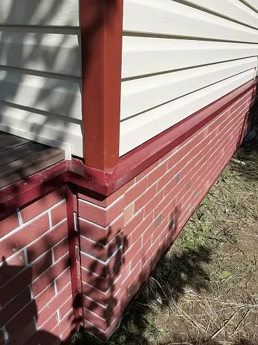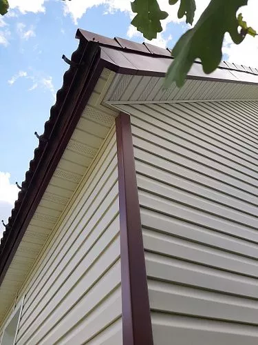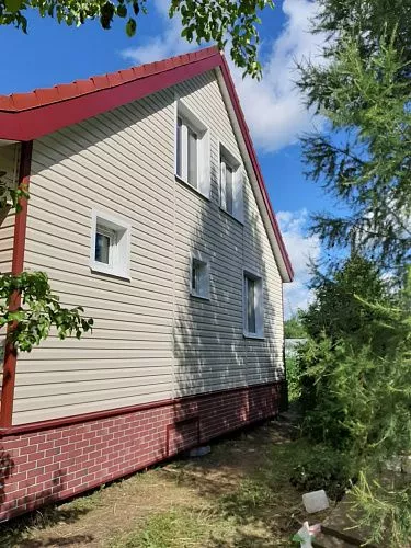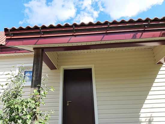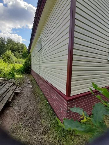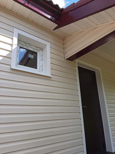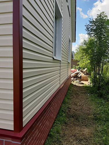 Отделка дома виниловым сайдингом корабельный брус Docke D45D Сливки с отделкой элементов металлическими комплектующими красного цвета RAL 3005