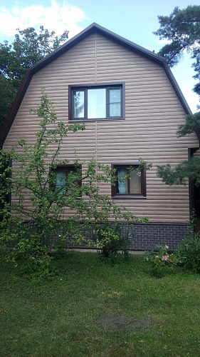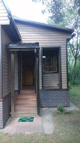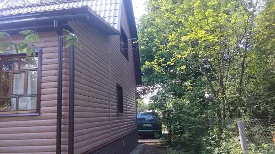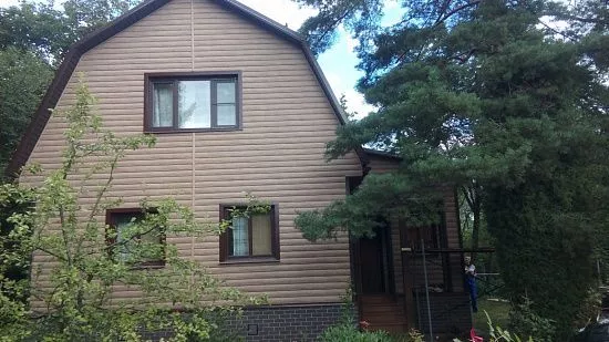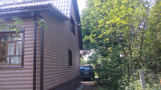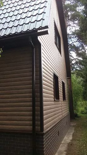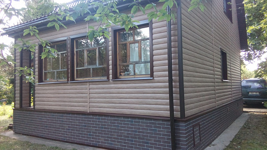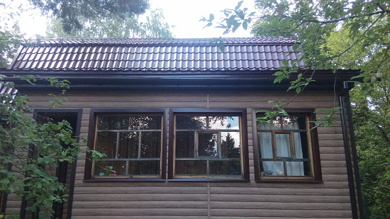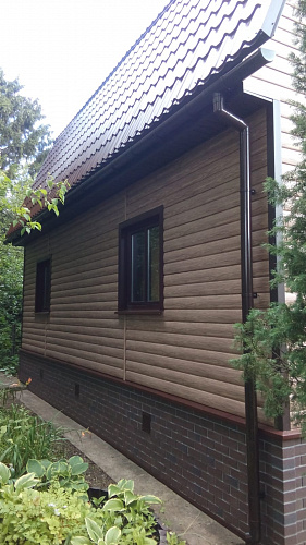 Отделка дачного дома виниловым сайдингом под дерево Docke Lux Блокхаус Кедр, установка водосточной системы Docke Premium Шоколад, ремонт крыши и замена кровельного покрытия на металлочерепицу Grand Line Classic Коричневый