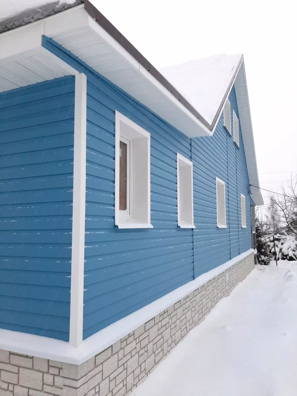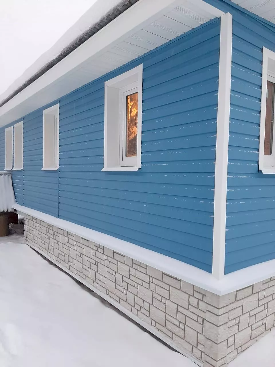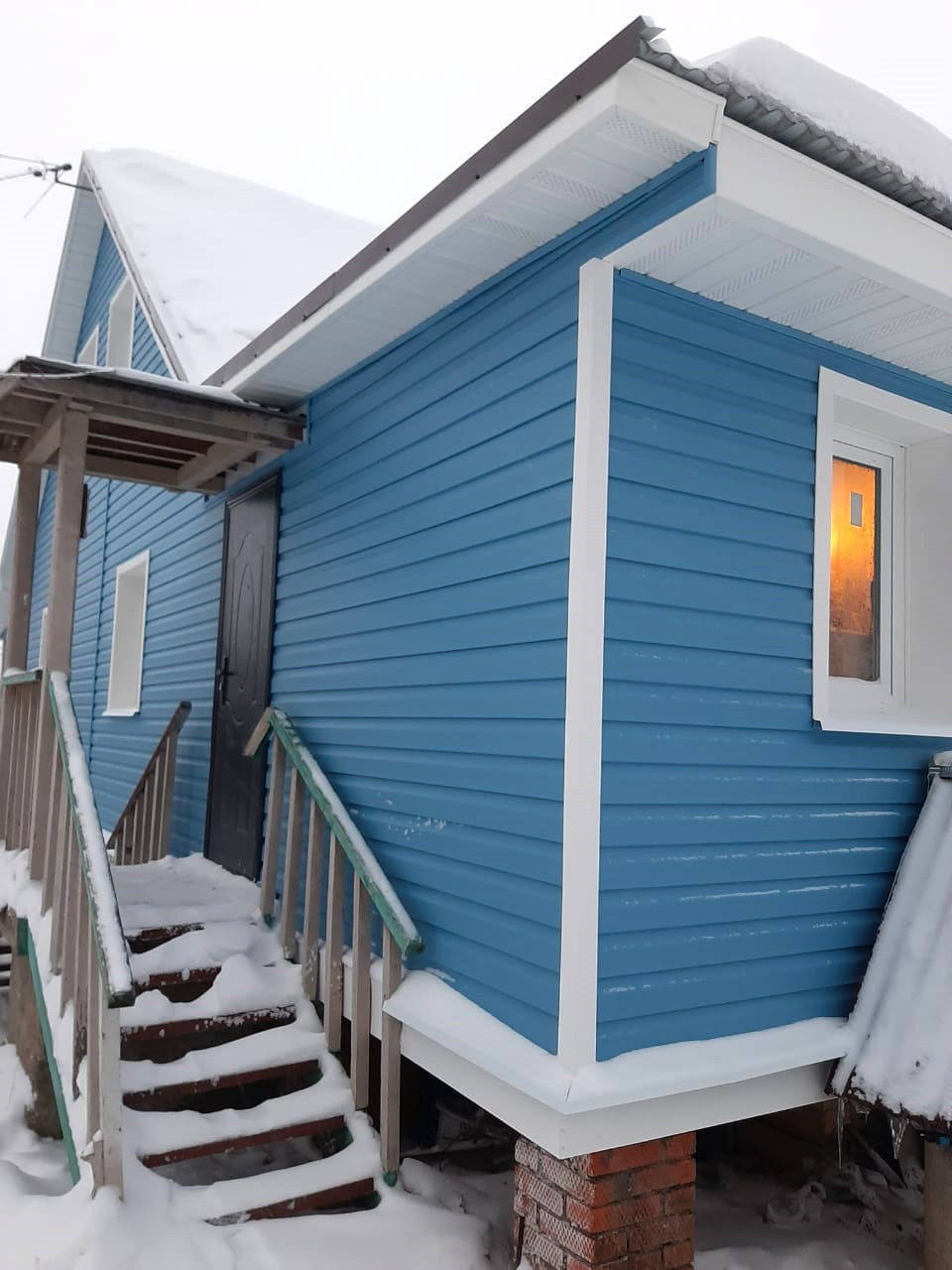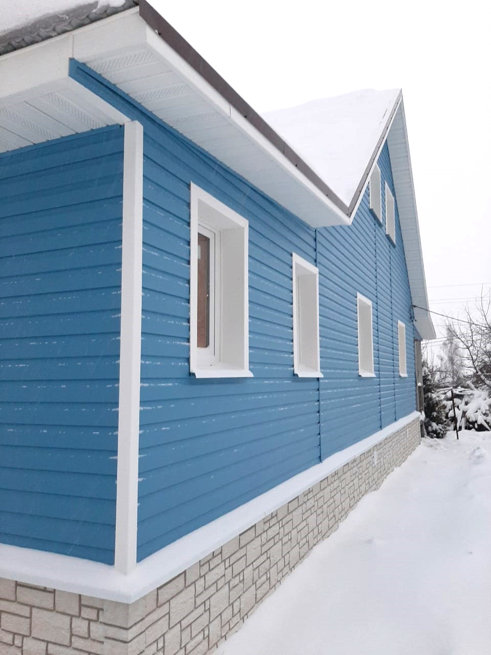 Отделка дома синим виниловым сайдингом Docke Корабельный брус слива и замена кровельного покрытия на металлочерепицу Металлпрофиль