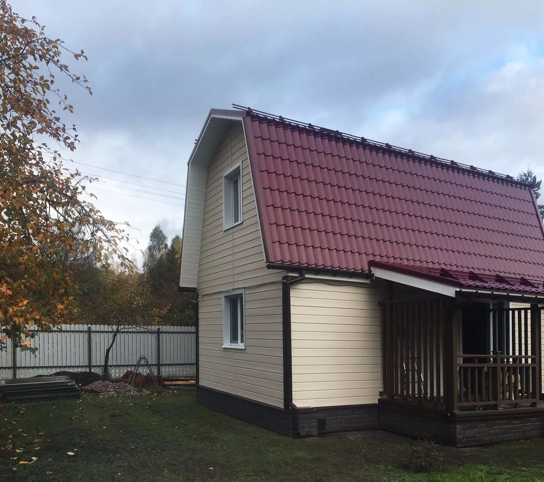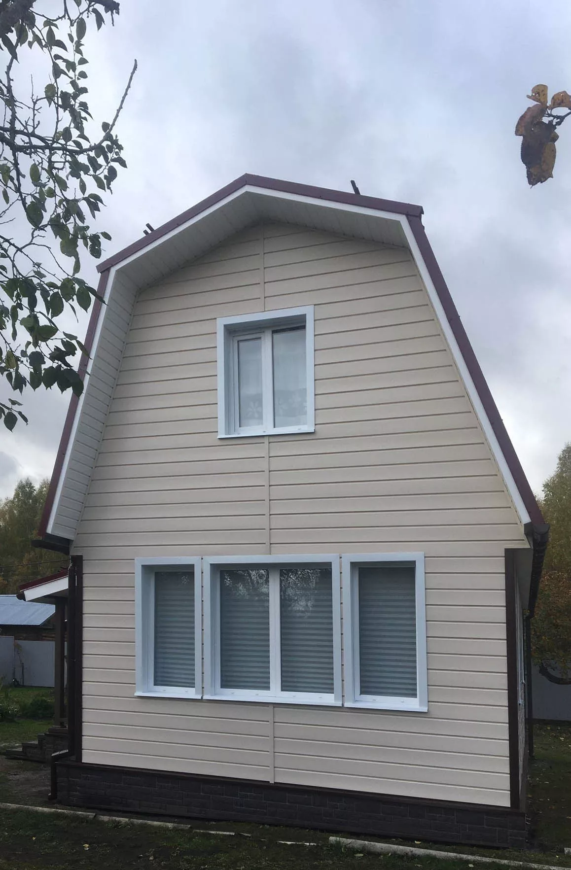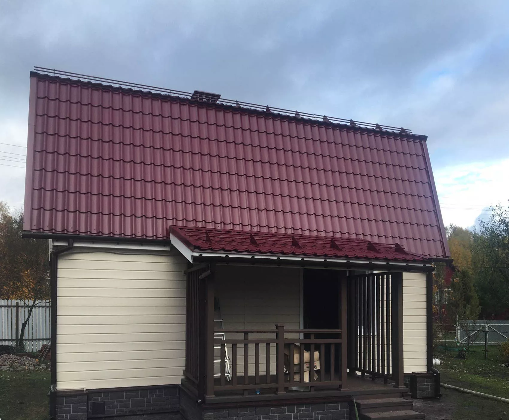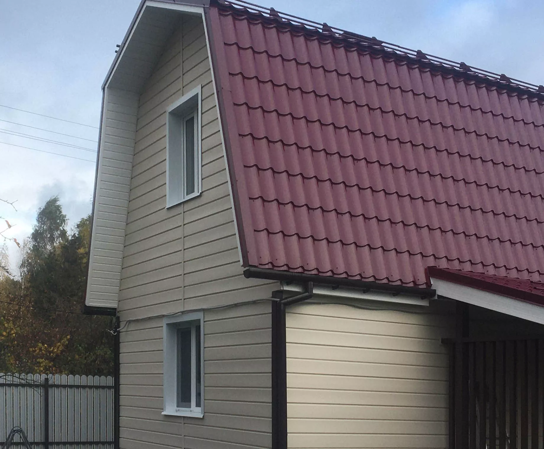 Отделка фасада дома сайдингом Docke Брус цвета Сливки, хамена кровли на металлочерепицу Металлпрофиль RAL 3005, установка водосточной системы Docke Standard шоколад, отделка цоколя панелями Docke Burg Земляной