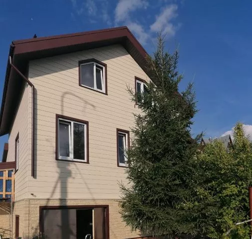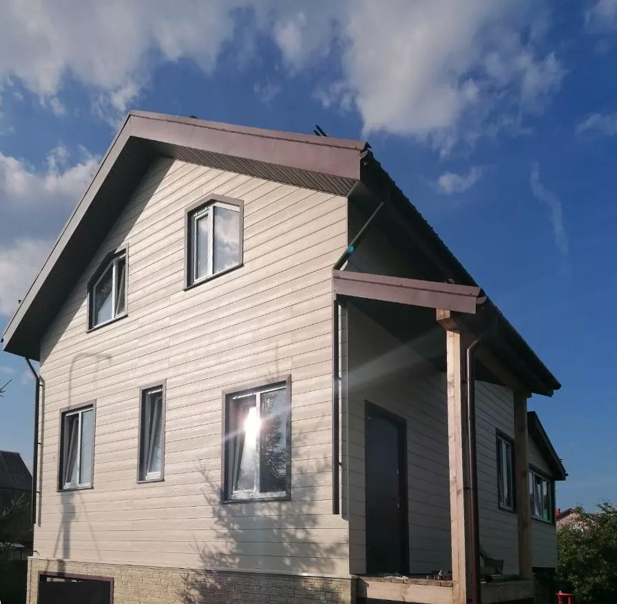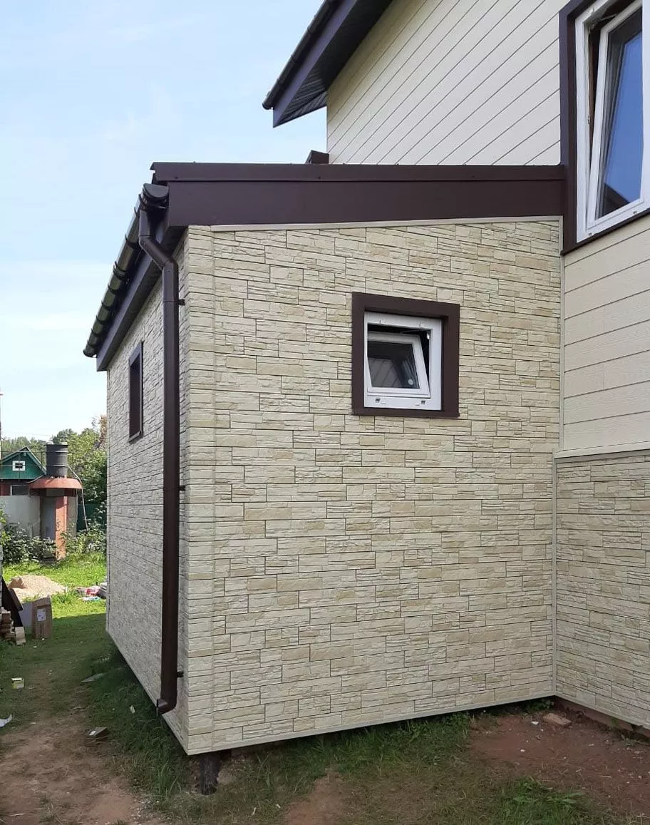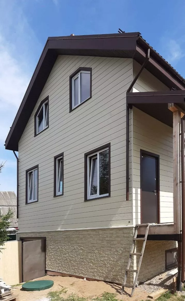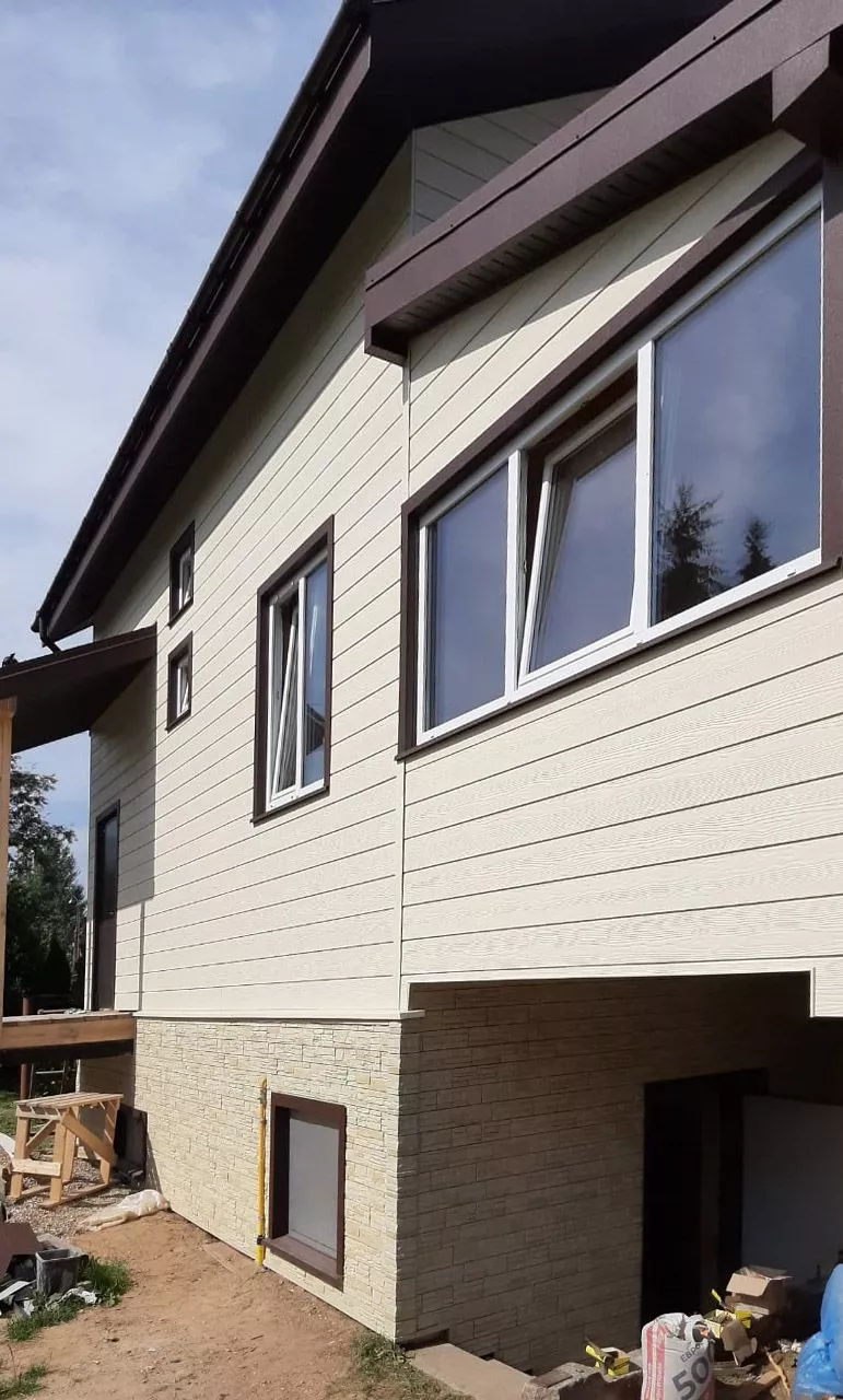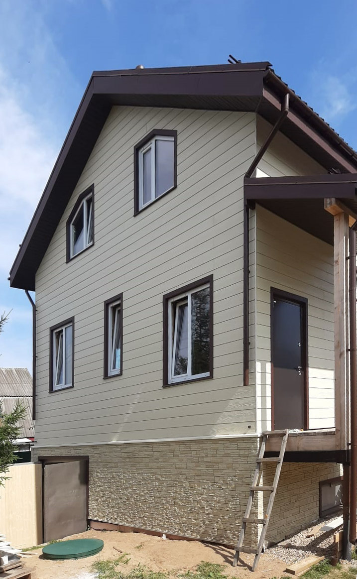 Отделка дома фиброцементным сайдингом Cedral Click С11 Золотой песок, с отделкой фундамента цокольными панелями Docke Stein Янтарный
