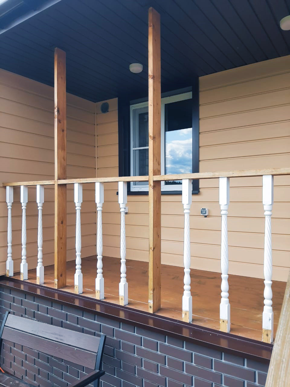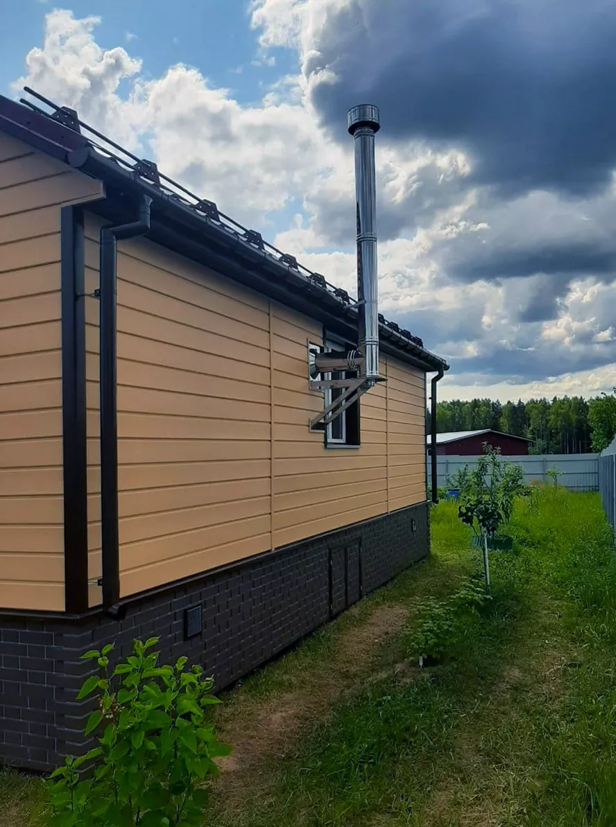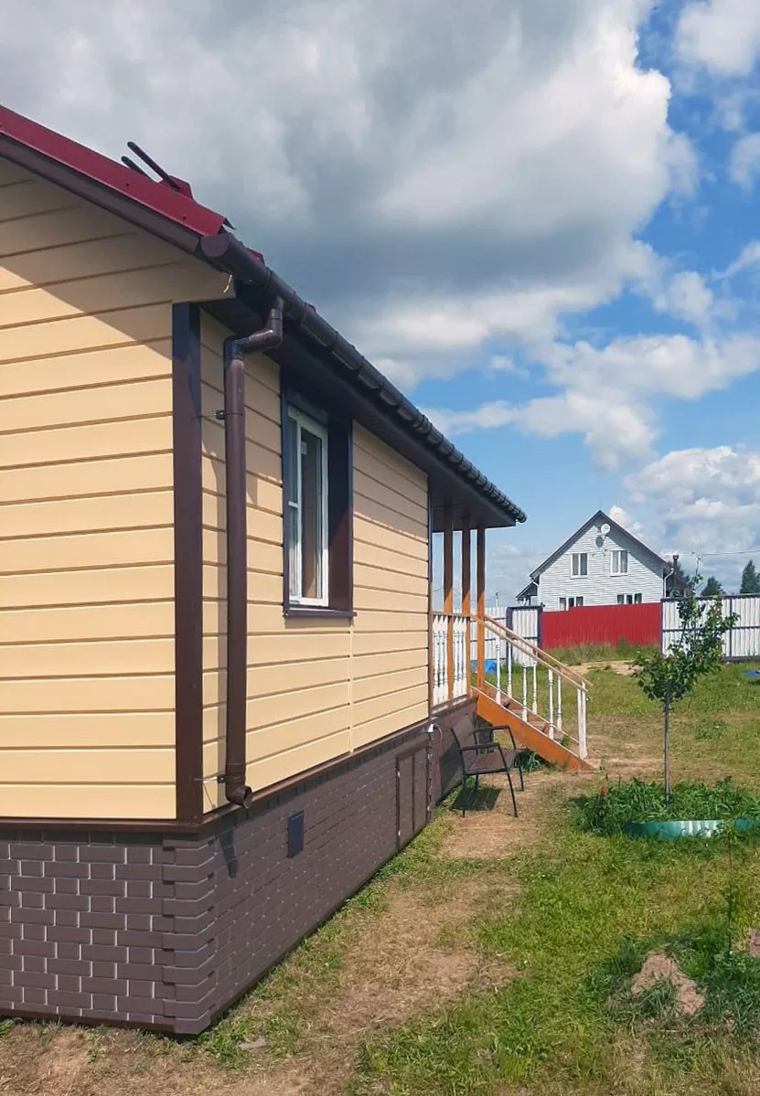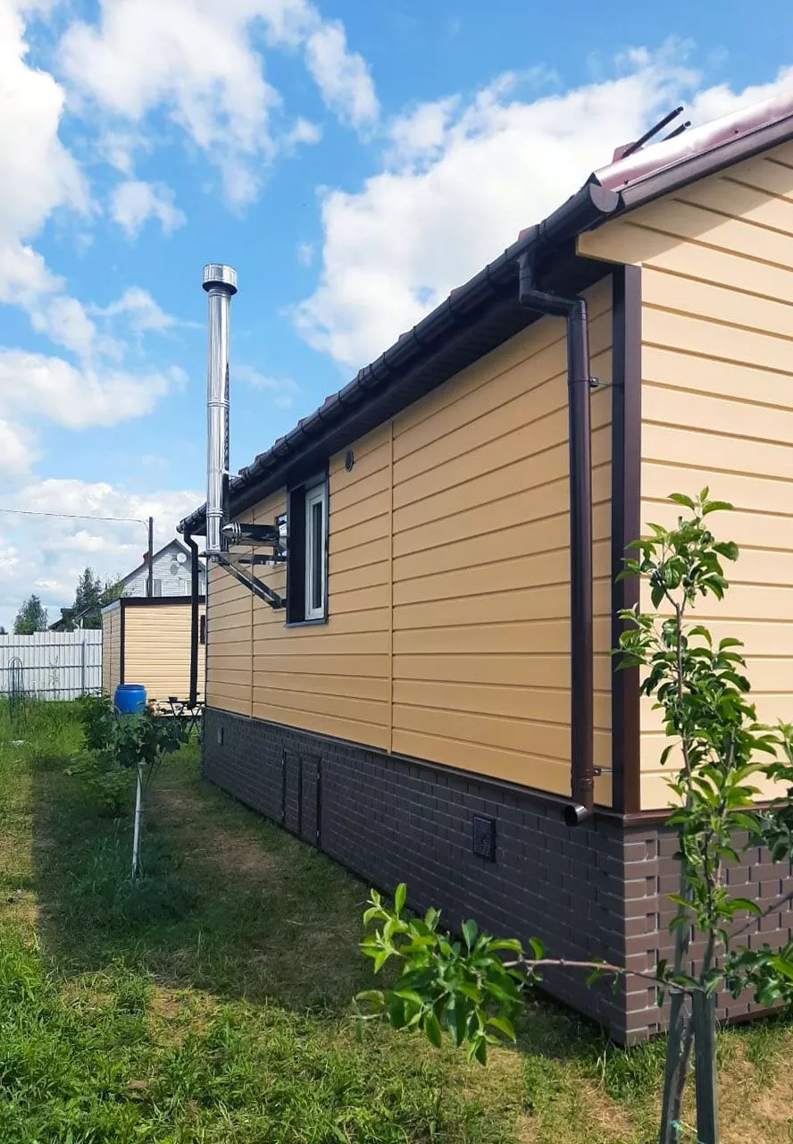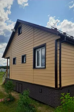 Облицовка фасада дома виниловым сайдингом Docke D6S Брус Манго, отделка цоколя фасадными панелями Docke Flemish Коричневый
