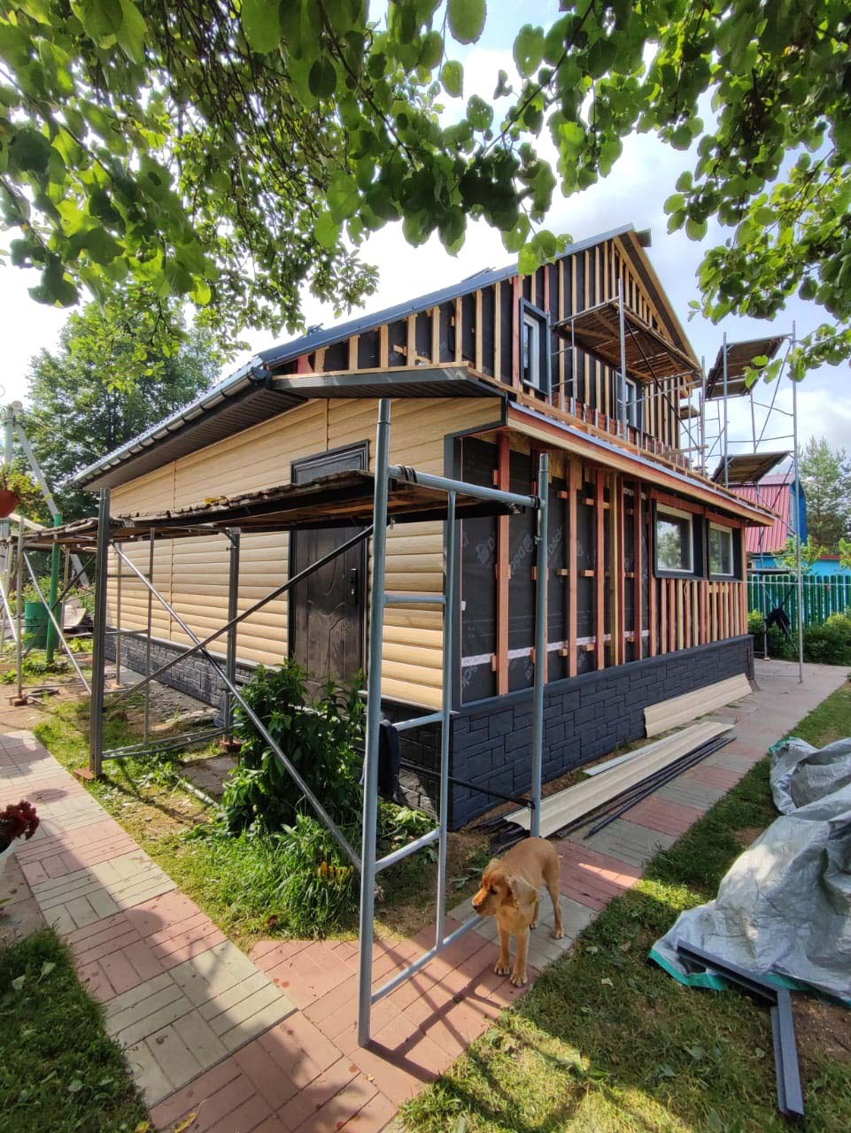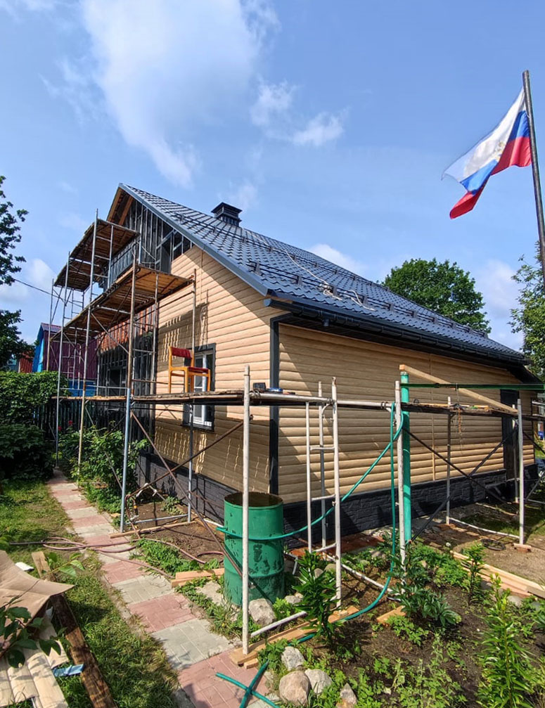 Отделка дома виниловым сайдингом Docke Блок-хаус Зрелый каштан, замена кровельного покрытия на металлочерепицу Металлпрофиль Монтеррей RAL 7024