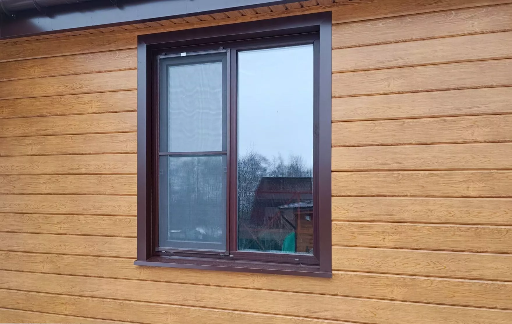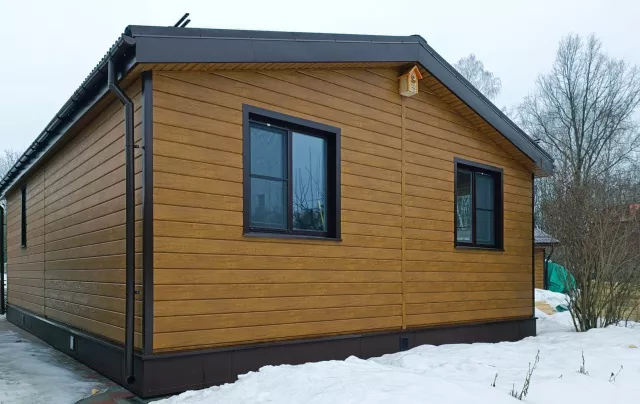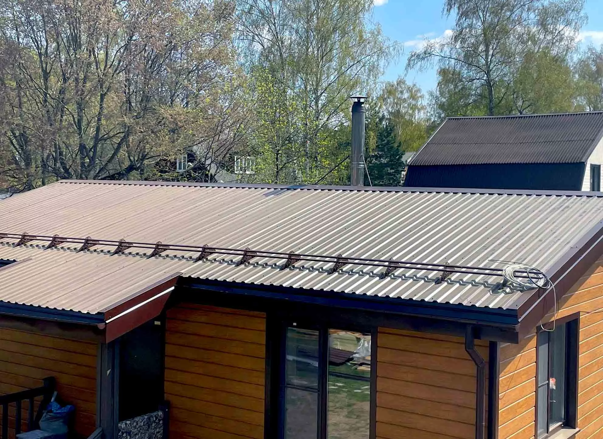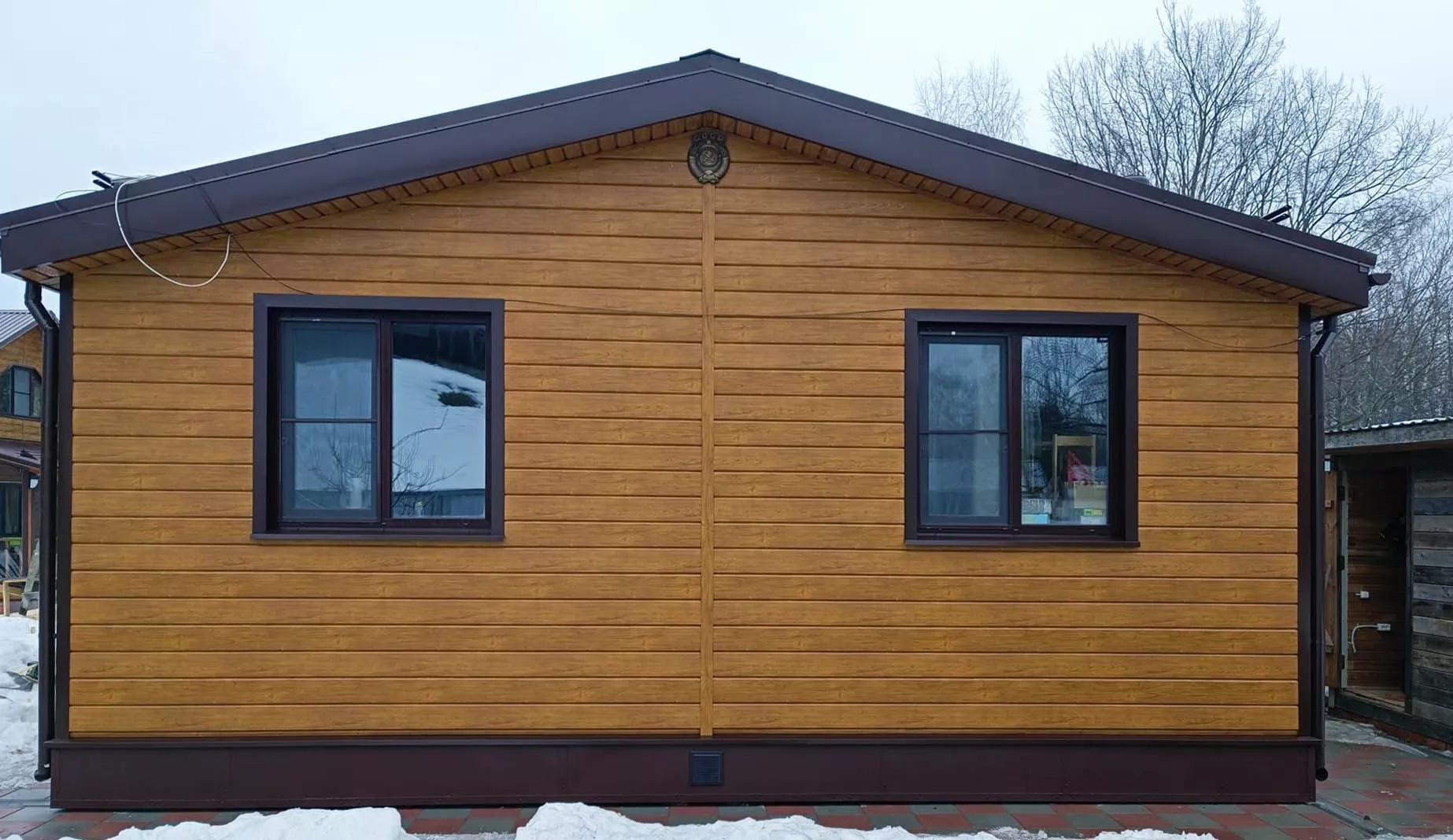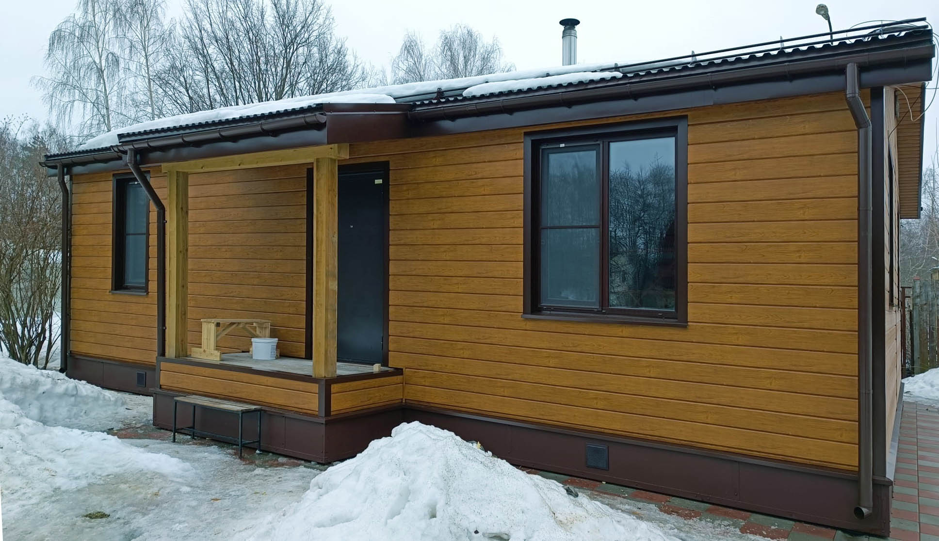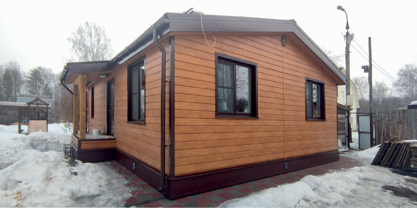 Облицовка дома металлическим сайдингом Grand Line ЭкоБрус Golden Wood, отделка кровли профилированными листами Металлпрофиль МП-20 RAL 8017